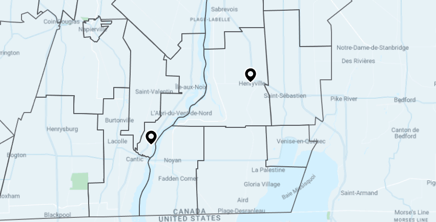 (Henryville, Lacolle, Mont-Saint-Grégoire, Noyan, Saint-Alexandre, Saint-Blaise-sur-Richelieu, Saint-Georges-de-Clarenceville, Saint-Jean-sur-Richelieu, Saint-Paul-de-l’Île-aux-Noix, Saint-Sébastien, Saint-Valentin, Sainte-Anne-de-Sabrevois, Sainte-Brigide-d’Iberville and Venise-en-Québec)